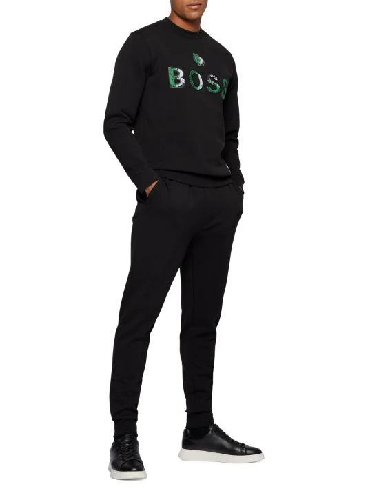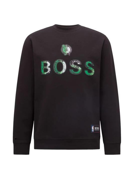 In a collaboration with the NBA, HUGO BOSS presents their themed activewear collection featuring logos from superteams like the Boston Celtics®. From the BOSS x NBA® Collaboration. A large brand logo infused with Boston Celtics® imagery is emblazoned across the chest of this crewneck sweatshirt.