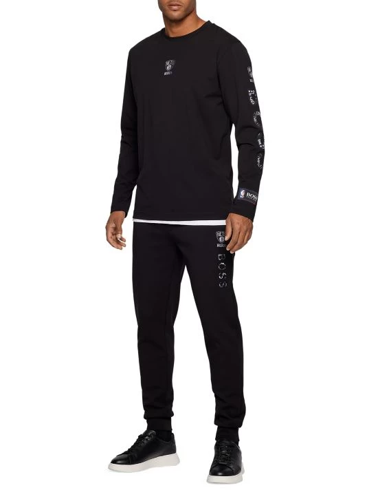 In a collaboration with the NBA, this HUGO BOSS themed activewear collection features logos from superteams like the Brooklyn Nets, Houston Rockets, and more.In a cotton-blend, this long-sleeved shirt is adorned with the BOSS logo down each arm and the Nets logo front and center on the chest, all tied together with a classic crewneck.