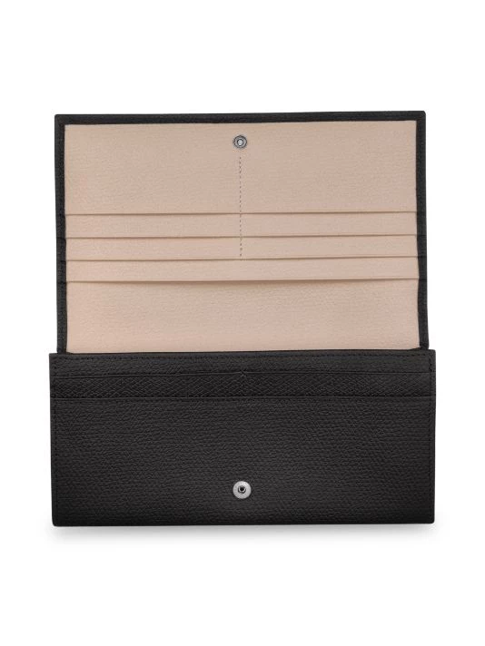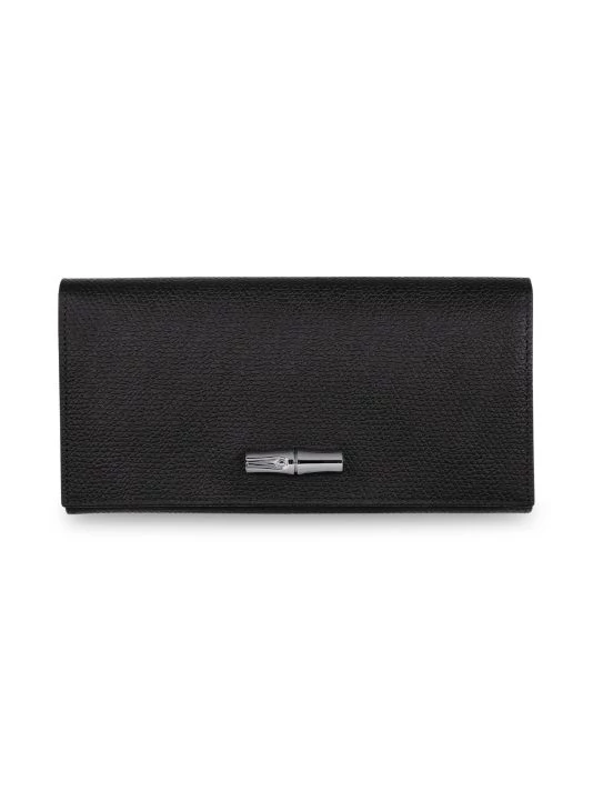 This compact continental wallet features faux bamboo hardware which adds an exotic touch to this textured leather piece.